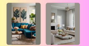 And let’s talk about the details! The big leafy plant isn’t just decoration; it’s practically a green, leafy roommate adding fresh air (and probably judging your TikTok dances). That cool woven light hanging from the ceiling? It’s giving off major resort vibes, making every evening feel like a vacation, even if you’re just doing homework. Plus, those bright blue vases and fun yellow decor on the coffee table tie everything together so perfectly, it’s like they all agreed to be awesome. This vibrant space clearly says, ‘Stress? Never heard of her!’ making it the ultimate spot for chilling out and soaking up all the good energy.