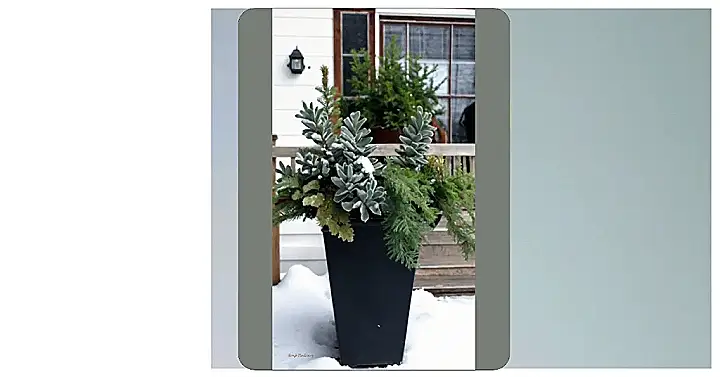 Imagine stepping outside your front door and being greeted by a beautiful, snowy scene. But wait, that’s not just a regular snowdrift! It’s a lovely winter planter filled with evergreen branches and fluffy, silvery-green plants, making your porch look like a miniature winter wonderland. It’s like Mother Nature decided to give your front porch a little holiday makeover.