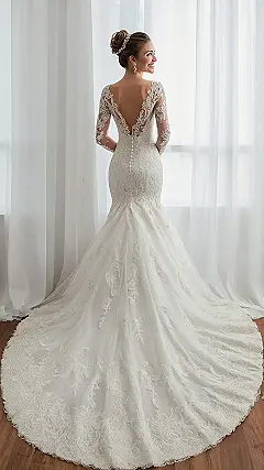 Planning your dream wedding? Check out this dress! The lace sleeves and the low back are super classy, but that train! Talk about making an entrance. Just picture yourself walking down the aisle; everyone will be staring! Just make sure someone is there to help carry that thing!