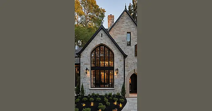 But don’t let the medieval-ish stone fool you; this place is totally living in the now, especially with that massive, arched window staring out like a giant, super-HD screen. It’s not just a window; it’s practically a portal to awesome natural light, and with those dark, sleek frames, it feels incredibly modern and chic. Add in the perfectly lit garden, making everything glow like it’s ready for a magazine photoshoot, and you’ve got a home that perfectly blends the grandeur of the past with all the sleekness and sparkle of today. It’s the kind of house where you could totally imagine throwing a royal-themed party, but with a killer sound system.