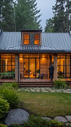 Seriously, look at those huge glass doors! It’s like stepping straight into a nature magazine. You could practically reach out and grab a pine cone from the forest. The person standing there probably just got back from a long hike and is ready for some hot chocolate. That stone accent above the windows is a neat touch too, it’s like nature’s own artwork built right into the house. The whole design is just perfect for someone who wants to live comfortably amongst the trees, without sacrificing any style.