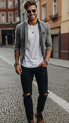 This guy clearly didn’t wake up asking, “What should I wear?” He just threw on the coolest grey blazer, a fresh white tee, and some expertly ripped black jeans that probably cost more *because* of the holes. He looks like he could be heading to a fancy dinner, a casual hang, or just casually walking down a street proving that stylish mens outfits don’t have to be complicated. Plus, that confident smile probably makes everything he wears look ten times better – maybe that’s the real secret!