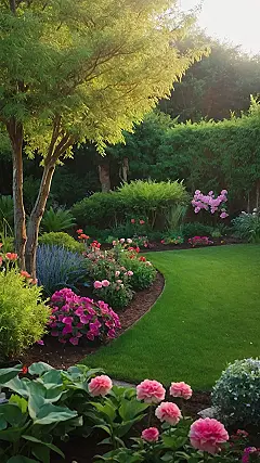This garden is like stepping into a fairytale! It’s bursting with vibrant colors, from the bright pinks and reds of the flowers to the lush green of the grass. It’s the kind of place where you could imagine fairies hiding in the bushes, or a friendly gnome popping out from behind a tree. The sun is setting, casting a warm glow over everything, and the air is filled with the sweet scent of blooming flowers. You can almost hear the gentle rustling of leaves in the breeze, and the chirping of birds hidden among the branches.