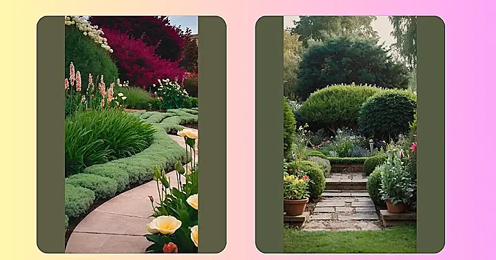 This picture is like a secret portal to a dreamy garden. It’s got everything a garden needs: lush green bushes, a path made of stepping stones, and a bunch of colorful flowers that look like they could tell you secrets if you whispered close enough. The path leads you through a maze of beautiful plants, and you can almost imagine a friendly gnome hiding in the bushes, ready to give you a tour.