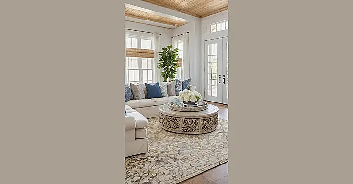 Look around and you’ll spot all the little details that make this space extra snazzy. That woven side table? It’s basically a chic little basket demanding you put a cold drink on it. The light blue rug swirling on the floor looks like it’s trying to sneak in a little piece of the ocean itself. Everything just works together to create a spot that’s fancy enough to impress, but laid-back enough that you won’t feel weird kicking your feet up. It’s the perfect mix of coastal coolness and seriously good style.