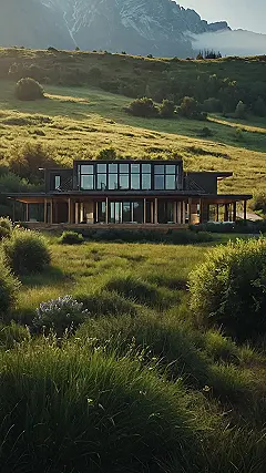 This house looks like a dream come true! It’s nestled in a valley with big, beautiful mountains in the background. The green grass and trees make it feel super peaceful, like you could just relax and forget about all your worries. You can see the house has tons of windows, letting in all that beautiful natural light. It’s like living in a nature scene, but with all the comforts of home.