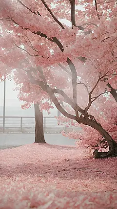 Imagine a world painted in soft pinks and misty greys! This picture is like stepping into a dreamy fairytale, where a giant, fluffy pink tree leans over a calm lake. It’s so peaceful, you could almost hear the gentle whispers of the wind through its branches. It’s like that tree is wearing a cloud of cotton candy blossoms – super cute and totally Instagrammable!