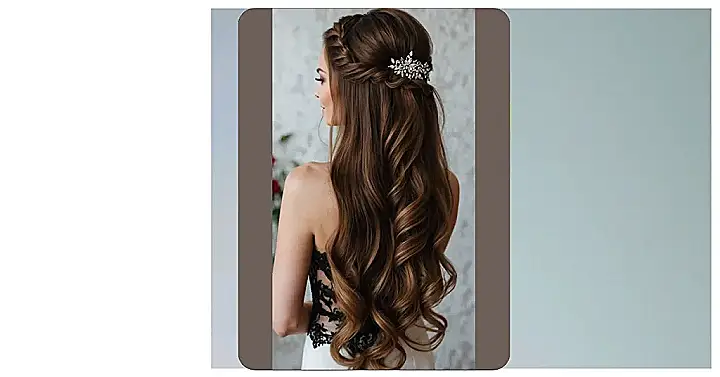 On your big wedding day, you want hair that’s not just ‘nice,’ but totally ‘wow’! This style, with half of it swept back neat and the rest flowing in gorgeous waves, is basically saying, “Yep, I’m here to get married and look fabulous doing it.” That sparkling hairpiece isn’t messing around either; it adds just the right amount of bling, like a little starburst in your hair. Itโs the perfect mix of practical (keeping some hair back) and party-ready (hello, amazing waves!), making you feel ready for anything, from the vows to the dance floor madness.