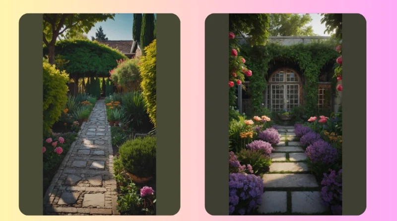 This garden is like a scene straight out of a fairy tale. Imagine you’re walking through a secret passage, with tall, leafy walls on either side. You see a beautiful archway leading to a cozy courtyard. The sunlight shines through the windows, creating a magical glow on the stone path. The scent of blooming flowers fills the air, and you can’t help but feel a sense of peace and wonder.