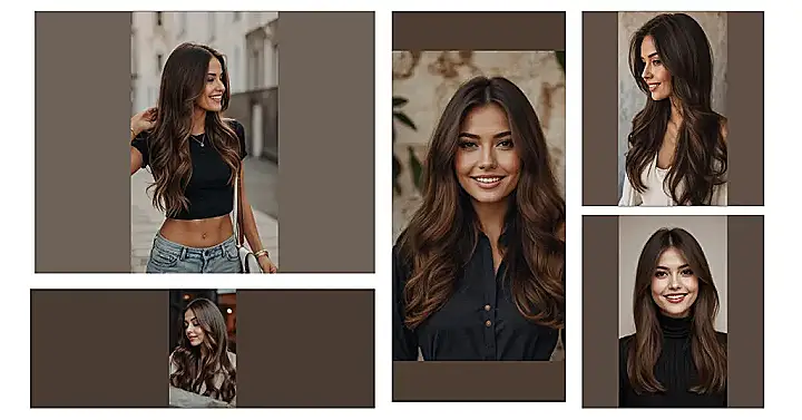 With hair this stunning, you’d think she’d be too busy brushing it to smile, but nope! That grin is so infectious, you almost expect her to spill the tea on some hilarious secret she just heard. Maybe her hair actually told her a joke! This ‘rich brown hair color’ isn’t just a shade; it’s like a warm hug for your face, adding extra sparkle to those bright eyes and making her whole vibe say, “Yep, I’m having a great day, and my hair is totally in on it.” It’s pretty clear this look is a total win-win for gorgeousness and good times.