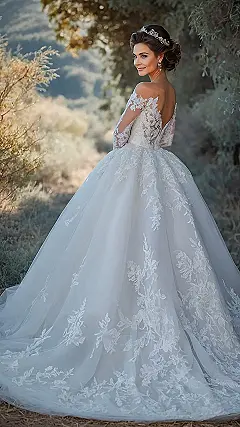 That dress is seriously next-level gorgeous! It’s like if a princess and a garden had a baby, and that baby was the most charming wedding dress ever. Look at all that lace! Imagine twirling around in that thing; you’d feel like you were floating on a cloud of bridal bliss.