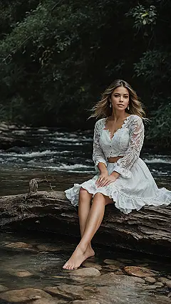 Landing a shot this fabulous in the middle of a river takes some serious commitment, right? Here we have our brave model, rocking a totally chic white lace dress, perched ever so delicately on a damp log. You can almost feel the chill from the river water swirling around her bare feet, which, let’s be real, is probably a lot colder than it looks! It’s all part of the magic of a river photoshoot, where looking super relaxed actually involves carefully balancing on a potentially wobbly log while trying not to get soaked.