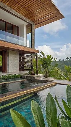 This Bali house looks like it was designed by a math genius who really loves triangles! It’s got that cool, modern vibe going on, like something straight out of a futuristic jungle movie. The wood and stone give it that natural feel, but the sharp angles make it feel super fancy. Can you imagine chilling by that pool, sipping on something fruity, and pretending you’re a secret agent on vacation?