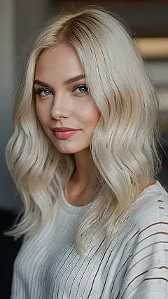 This picture shows a lady with gorgeous platinum blonde hair—the kind that makes you want to run your fingers through it (don’t worry, we’ll wait). It’s so shiny and wavy, it looks like liquid sunshine! She’s rocking a simple white shirt, but honestly, who needs anything else when you’ve got hair like that? It’s the ultimate accessory, like a golden halo, but way cooler. Seriously, this blonde is giving major hair goals.