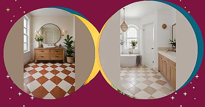 Walking into this bathroom might make you wonder if you accidentally stumbled onto a giant chessboard! Just picture trying to make your first move with a rook or a knight – probably not great for brushing your teeth. But hey, this awesome checkerboard floor, rocking those cool reddish-brown and creamy squares, is set to be a huge design hit for 2026. It brings such a fresh, playful vibe that totally makes this space feel warm and super inviting, even without tiny chess pieces scattered everywhere!
