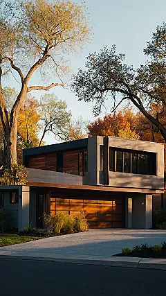 This house isn’t your grandma’s suburban home! It’s got that sleek, modern look with sharp angles and big windows, perfect for showing off your amazing autumn leaf views. Imagine having movie night and watching the leaves change color outside—talk about a front-row seat to nature! The garage door is like a giant, stylish wooden puzzle piece fitting perfectly into the design, making even parking feel a little bit fancy.