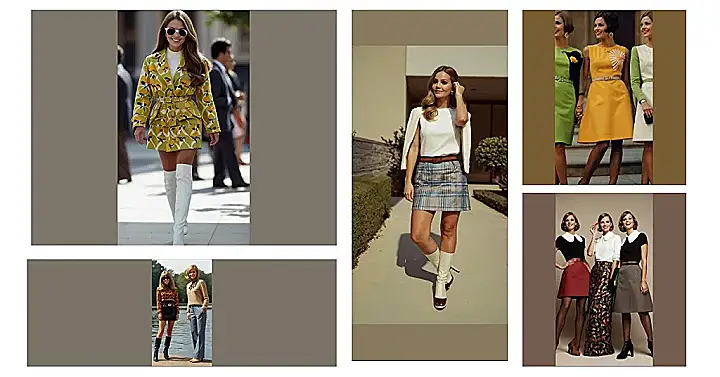 This image is a total blast from the past, taking us straight back to the swinging sixties! It’s like a fashion magazine exploded all over the page, with groovy outfits that scream “Peace, Love, and Flares.” From bold printed blouses and bell bottoms to bright, colorful accessories, this collage captures the essence of 60s style. It’s like a visual time machine that lets you step back in time and imagine yourself dancing the night away in a groovy club.