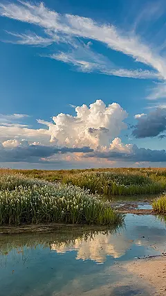 Then you get to the ground level, and it’s like the plants decided to throw a huge white-flower party right next to that calm, reflective water. The water itself is showing off too, acting like a giant mirror, perfectly reflecting those show-off clouds and making the whole scene double the awesome. It’s almost like the water is saying, “Whatever you can do, sky, I can reflect better!” If you ever needed proof that nature doesn’t need filters to be epic, this snapshot is definitely it.