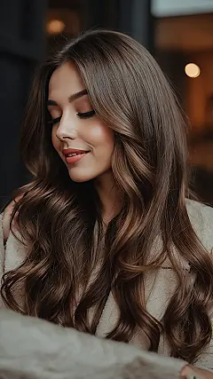 This picture gives major hair goals, right? We’re talking about that rich brown hair color that looks so smooth and bouncy, it practically has its own fan club. It’s like someone bottled up all the cozy feelings of a perfect autumn day and poured it straight onto these beautiful waves. You know, the kind of shade that looks effortlessly cool whether you’re rushing to class or just chilling with friends, making everyone wonder if you’ve got some secret hair wizardry going on.