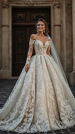 When you picture a “dream wedding dress,” it’s often something big and fancy like this one, covered in sparkle and lace that took forever to create. It makes you think about that perfect day, gliding along like you’re in a movie, even if the reality might involve slightly sweaty palms and hoping nobody spills gravy on you. Finding *that* dress is a huge part of the fun dream, picturing yourself looking totally stunning, even if wearing it means needing a personal assistant just to help you sit down.