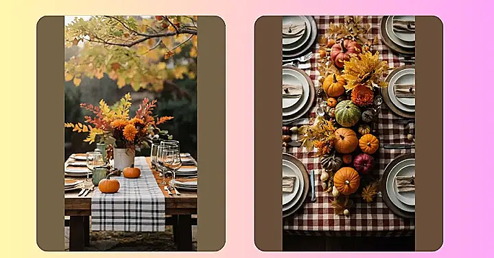 I think it’s really cool how the table setting matches the season. The checkered tablecloth looks like a warm plaid shirt, and the pumpkins are like little decorations all over the table. It makes you feel like you’re in a cozy cabin in the woods, surrounded by nature. And I bet this table makes everyone feel extra special, because it’s all dressed up for a special occasion!