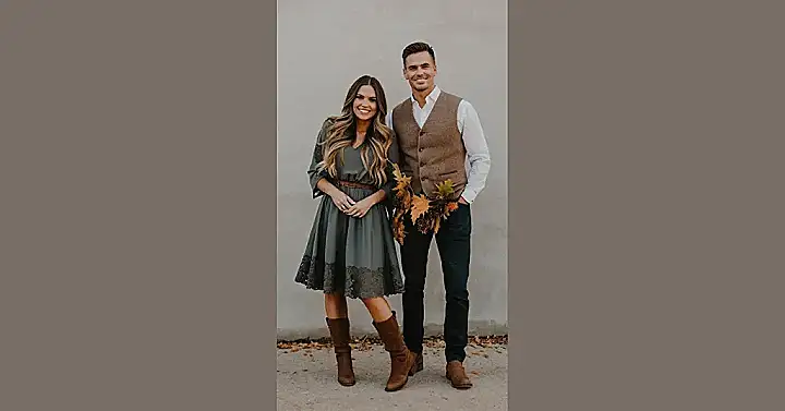 This couple is totally rocking the fall family picture look! She’s got the perfect flowy dress, some stylish brown boots, and a cute belt to cinch it all in. He’s keeping it classic with a white shirt and a brown vest, and those jeans are totally on point. They even have some autumn leaves to complete the picture-perfect vibe. You know what they say, a little bit of fall fashion goes a long way!
