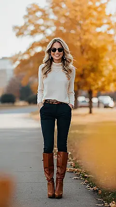 This outfit is like a warm hug on a chilly day! The creamy sweater is the perfect antidote to those blustery fall winds. And those brown boots? They’re totally giving us “ready for adventure” vibes. It’s like the perfect blend of cozy and cool, right? You can totally rock this look for a day of pumpkin picking, a trip to the library, or even just hanging out with friends!