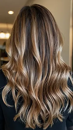 This picture shows a woman with absolutely gorgeous hair! It’s like a delicious mix of chocolate and caramel, and it’s called “bronde balayage”. It’s basically a fancy way of saying that her hair is a blend of brown and blonde, but it’s not a boring, even color. Instead, there are streaks and highlights that make her hair look super dimensional and awesome! It’s like she’s got a million little sun-kissed strands all over her head, and it’s totally the perfect look for fall, when the leaves are changing color too.