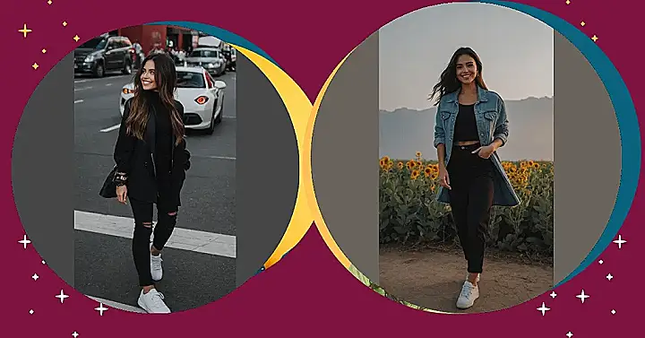 This girl is totally rocking the casual look! It’s like she just stepped out of a fashion magazine, but in a super chill, down-to-earth way. She’s got the classic denim jacket, paired with comfy black pants and cute white sneakers. Who needs fancy clothes when you have a sunflower field to wander through? It’s the kind of outfit that’s perfect for a day of adventures, whether you’re meeting friends, grabbing some ice cream, or just hanging out with your bestie. And let’s be honest, that smile is contagious. It just screams “I’m happy and I’m having a great day!”