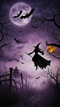 Get ready to fly high with this awesome Halloween wallpaper that’s more fun than fright! Our witch here is seriously zooming across the purple sky, probably trying to beat all her friends to the best trick-or-treat houses. With a whole swarm of bats as her personal escorts and a giant, glowing moon lighting her way, she’s practically a Halloween superhero. You can almost hear her cackling with joy as she zips past, ready for all the spooky good times!