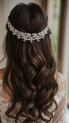 And can we talk about that stunning sparkly accessory? It’s like a little crown of delicate leaves and crystals tucked right into those perfectly styled locks, adding just the right amount of shimmer to your whole vibe. It makes the entire look feel extra special and elegant without being over the top – perfect for celebrating ‘I do’s’ when the air is crisp and the leaves are changing. Get ready to turn heads and probably get asked for your hair secrets all night long!