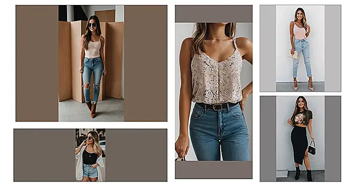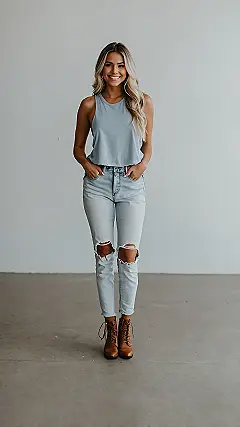 Then she pairs that awesome tank with light wash ripped jeans, which are basically the official uniform for ‘I woke up like this, but cooler.’ And who said you can’t wear heels with jeans and a tank? Our model shows us it’s a total power move, making the whole outfit pop without looking overdone. Plus, that fancy little clutch she’s holding probably holds all the essentials, like your phone, lip gloss, and maybe an emergency candy bar. This outfit proves that your trusty tank top isn’t just for P.E. – it’s for making a statement, one stylish ripped knee at a time!