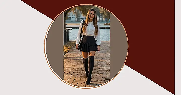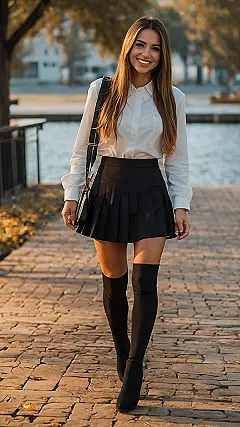 This girl is rocking a seriously cute outfit, and it all starts with that awesome black skirt! It’s like she’s straight out of a fashion magazine, and her skirt totally makes the whole look pop. Plus, those thigh-high boots are giving off major “I’m totally confident and ready to slay” vibes. Who needs a cape when you have legs like that?