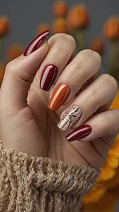Ready to ‘sleigh’ the holiday season with your hands? These nails are absolutely crushing the December vibe! We’re talking rich, deep reds and a burnt orange that practically smell like pumpkin spice lattes and crackling fireplaces. They’re so warm and inviting, you might even mistake your fingertips for tiny, festive ornaments. And let’s not forget that snuggly sweater cuff – it’s practically begging for you to hold a mug of hot chocolate or expertly wrap a gift (without chipping a single nail, fingers crossed!).