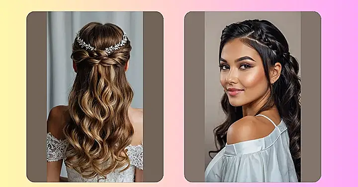 Getting married? This hairstyle is like the ultimate cheat code for looking amazing! Seriously, it’s like your hair gets a fancy makeover where some curls are pinned up all elegant-like, and the rest get to just hang out and do their natural, bouncy thing. Plus, that little sparkly headband? Pure bridal magic! It’s basically saying, “I’m here to party, and my hair is definitely invited.”