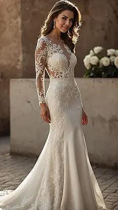 Check out this amazing dress! It’s totally rocking the ‘fit and flare’ style, which basically means it gives you that super cool, hugged-in look through the body before dramatically swooshing out at the bottom. All those intricate lace details and the sheer sleeves make it look like something straight out of a fancy movie, making anyone feel like a total superstar. This bride is definitely radiating ‘ready to own the room’ vibes, and probably wondering if she can still sneak in an extra slice of cake later!