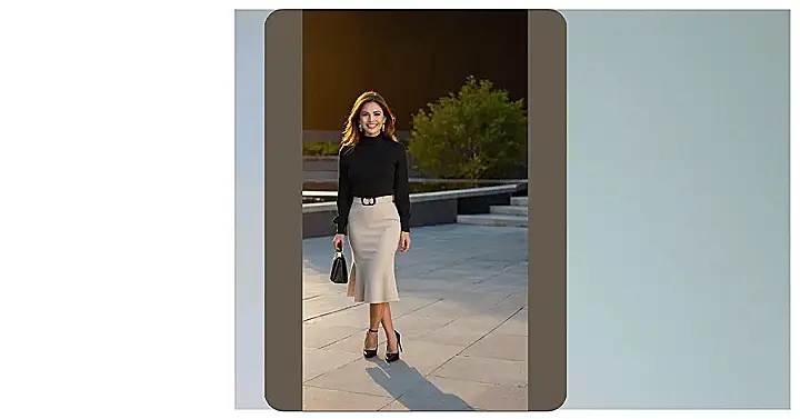 This lady’s got a look that’s totally rocking! That skirt is giving off serious “swishing” vibes, like she’s about to twirl right out of that picture. The way it flows out makes you feel like you’re watching a fancy dress party, but in a modern way. It’s like she’s saying, “I’m here to impress, but keep it classy.”