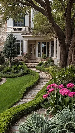 This house isn’t just a home; it’s practically a floral VIP lounge! You’ve got this incredible stone pathway that winds its way up, looking like it belongs in a fairytale, all neatly bordered by perfectly trimmed green hedges. But let’s be real, the real stars of the show are those vibrant pink flowers in the foreground, totally photobombing the picture with their amazing color. They’re basically screaming, “Welcome to the coolest place on the block!” making the whole entrance feel super inviting and maybe a little bit magical, like something out of a dream.