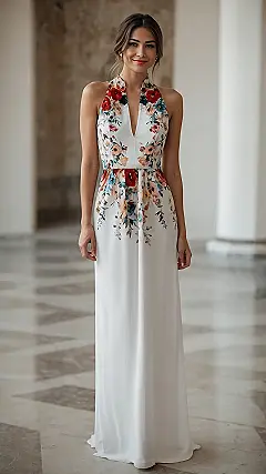 It’s almost like this dress is whispering, “Walk with confidence, because you’re basically a masterpiece!” This flowing gown, with its beautiful train gently sweeping the floor, definitely makes you feel like royalty without needing an actual crown. The combination of the bold flowers and that smart halter neck design screams “I’m here to have fun and look fabulous doing it.” And with an outfit this vibrant and full of life, who needs complicated accessories? Just a huge smile, a cute clutch, and maybe a friendly heads-up for any actual bees in the vicinity that this stunning flower is strictly for admiring, not pollinating!