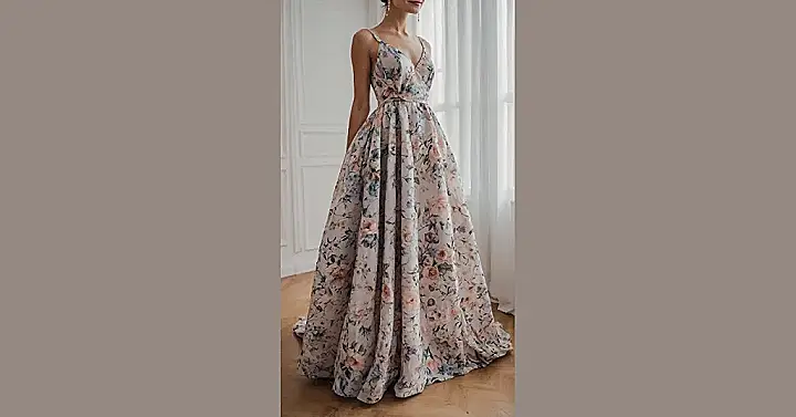Sporting a gown this stunning, you’d be ready for anything, whether it’s a fancy school dance or just looking super chic while grabbing a smoothie. It’s got that perfect flowy length for a dramatic entrance, but it’s still practical enough that you won’t trip over your own feet trying to bust a move. The mix of bold and subtle flowers makes it stand out without being over-the-top, proving that sometimes, all you need is a fabulous dress to feel like you can conquer the world (or at least ace that pop quiz you forgot about).