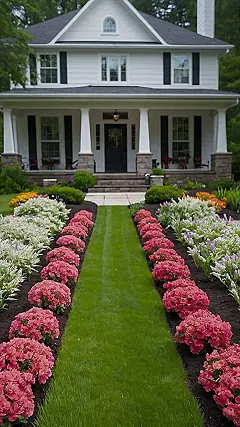 This picture is like a colorful party for your feet! It’s got these awesome flower beds, and they’re all lined up like a rainbow in front of a house. You can almost imagine yourself walking along the stone path, feeling the soft petals brush your ankles as you go.