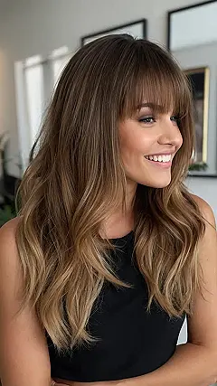 So, you want to rock a butterfly haircut like you’re about to star in a rom-com? This look in the picture nails that vibe! It’s like you took a regular long haircut and gave it some serious wings, with all those layers that look like they could just flutter away. Plus, the bangs are a super-cute touch, perfect for hiding when you accidentally make eye contact with your crush in the hallway (we’ve all been there!).