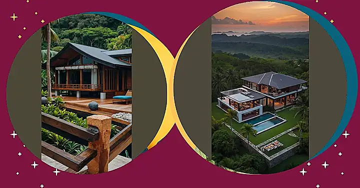 Imagine this: you’re chilling by a sparkling pool, the sun dipping below the horizon, painting the sky in amazing colours. This isn’t just any house; it’s a luxurious tropical villa, straight out of a dream! The picture shows a modern, super-stylish place with huge windows that let you soak in all the stunning views. It’s like the house itself is saying, “Relax! You deserve it!” With its sleek design and comfy-looking furniture, this place is perfect for a super relaxing vacation, whether you’re hanging out with friends or having some quality family time.