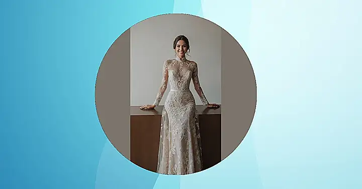 Wow, this dress just knows how to make an entrance! It’s like the ‘fit’ part of ‘fit and flare’ dresses decided to give her the ultimate stylish hug, showing off her natural glam without making her feel like a mummy wrapped in fabric. The way the delicate lace just flows all over the top, from those long sleeves right down to her waist, makes it look super elegant but also light and breezy. She’s definitely ready for her big day, probably planning to look this amazing while also enjoying all the cake!