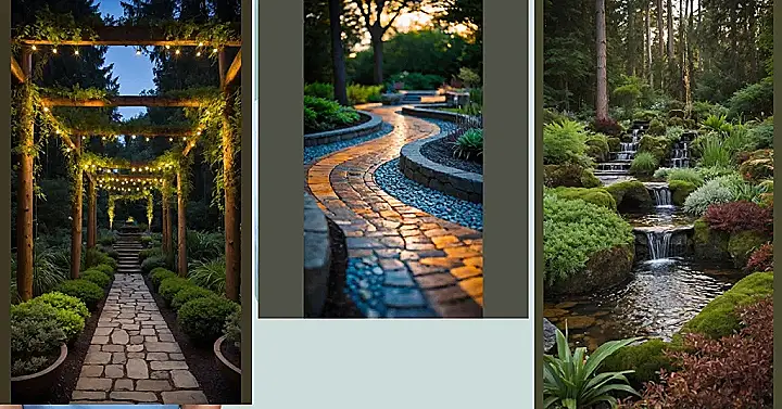 Walking into this forest garden feels less like a stroll and more like you accidentally crashed a fancy party thrown by plants! Seriously, look at all those string lights hanging around like botanical disco balls. You almost expect a giant fern to ask if you’ve seen the snack table or a tree trunk to start playing some smooth jazz. It’s got that cool vibe where nature meets quirky decorator, turning a regular path into something straight out of a dream… or maybe just a really well-planned backyard bash for squirrels.