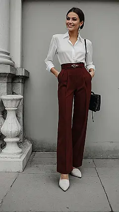 Looking at this outfit, you might think, “Wow, she looks like she’s ready to ace a presentation or maybe even run a whole company!” That crisp white shirt and those awesome maroon trousers are giving off serious “I’ve got this” vibes. It’s like when you try to look super grown-up for a school event, but she actually pulls it off with a smile that says, “Yeah, I look good, and I know it!” It just goes to show that trousers aren’t just for school uniforms or boring grown-up stuff; they can be totally stylish and make you feel like a total boss.