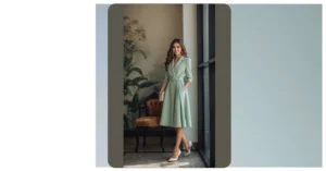 Who knew a pair of green trousers could look this good? This outfit is giving us major ‘I’m here, I’m fabulous, and I probably have a secret superpower’ vibes! The wide-leg trousers are basically a comfy superpower themselves, letting you stride like you own the place while looking totally put-together. Paired with that matching strapless top, it’s an instant confidence booster, making you feel ready to tackle anything from a pop quiz to a dance-off, all with a big, sunny smile like our model here. Move over, basic jeans, these women’s trousers outfits are here to steal the show!