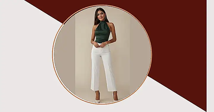 Wearing a halter top outfit this sharp probably gives you superpowers, like the ability to avoid awkward small talk or finding the perfect angle for every selfie. The combo of that vibrant green and pristine white is so fresh, it looks like it just stepped off a fashion magazine cover. Just a friendly warning: those gorgeous white pants are definitely a magnet for anything that might spill, so maybe hold off on the messy nachos while wearing this stunning ensemble. But hey, looking this fabulous is totally worth the extra napkin vigilance, right?