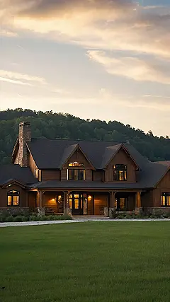 Wow, check out this amazing house! It’s like something out of a fairytale, all woodsy and warm, nestled against a hill with the prettiest sunset you ever did see. Imagine having a backyard so big you could probably play a game of soccer—or maybe even hide-and-seek with your friends for hours. This is definitely the kind of beautiful country home where you could unwind after a long day, maybe with a hot chocolate and a good book, enjoying the peaceful view. It’s the perfect place for anyone who dreams of escaping the city hustle and enjoying some real quiet time surrounded by nature.