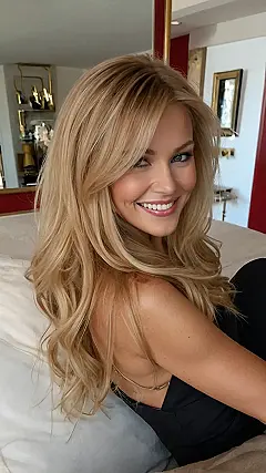 This girl’s got the hair that dreams are made of! It’s like a golden waterfall, cascading down her shoulders with all those soft, yummy waves. You can just imagine running your fingers through it, right? I bet it smells like vanilla and sunshine, and it definitely has that “I just got back from a beach vacation” vibe.